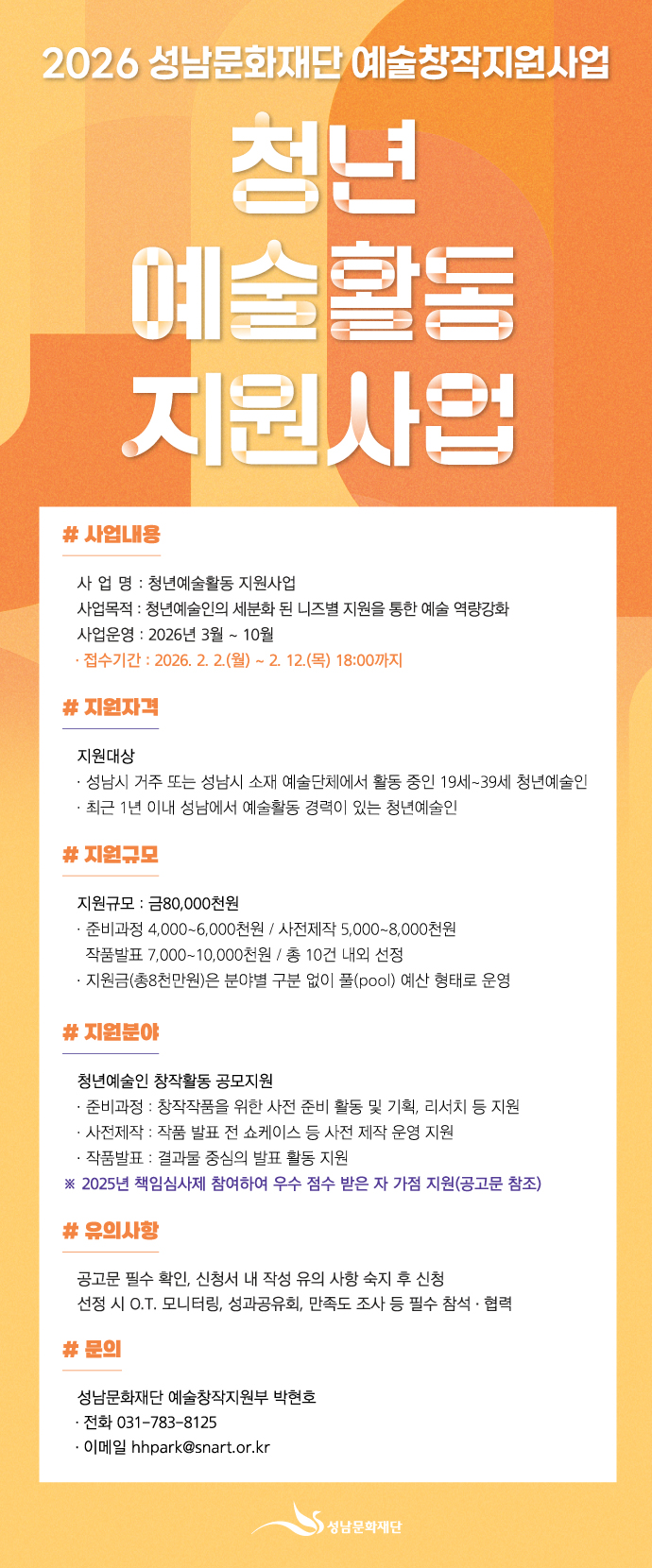 성남지역 예술인(단체) 중 19~39세 청년예술인 최근1년 이내 성남에서 예술활동 경력이 있는 청년예술인