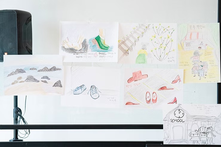 사각사각, 고요한 강의실이 연필 소리로 가득한 지 얼마나 지났을까. 이제 모두의 작품을 함께 감상하는 시간이다. 각양각색의 신발 여러 켤레, 할머니와 개나리, 길거리 떡볶이를 먹는 아이들의 모습 등, 다들 각기 다른 이미지를 그려 냈다. 이미지도, 색상 취향도 다르지만 무엇을 표현했는지, 왜 이 색상을 골랐는지 이야기하는 과정에서 서로의 기억을 자연스레 공유하고 공감한다. 그림을 매개로 일상의 치유를 경험하는 순간인 것이다.