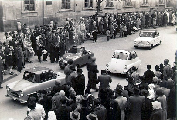 (우) 1956년 헝가리 노동절 행진. 왼쪽 첫 번째 자동차가 발라톤, 세 번째가 이세타, 마지막 자동차가 알바 레지아다 ©작자 미상