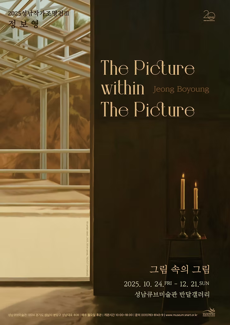올해 세 번째 성남작가조명전 <그림 속의 그림>은 빛과 공간, 시간의 경계를 탐구하며 그 안에 드러나는 감각적 구조를 회화로 구현하는 정보영의 예술 세계를 조망한다. 섬세한 명암의 흐름과 현실을 재구성하는 장면들 속에서 캔버스 너머의 현실과 환영, 존재와 부재 사이에서 흔들리는 경계를 조용히 생각해 보게 한다.
