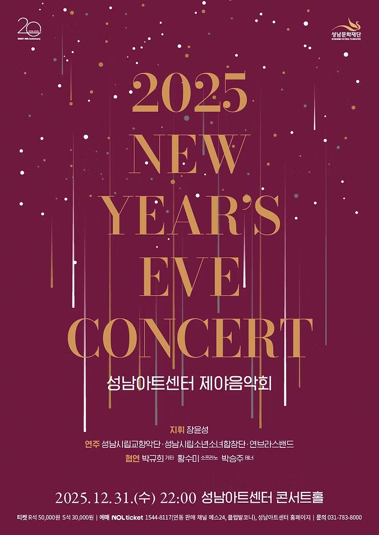 한 해의 마지막 밤은 음악이 전하는 울림과 함께 보내는 건 어떨까. <성남아트센터 제야음악회>가 12월 31일 성남아트센터 콘서트홀에서 열린다. 장윤성이 지휘하는 성남시립교향악단과 세계적인 클래식 기타리스트 박규희, 소프라노 황수미, 테너 박승주가 특별한 순간을 함께한다. 특히 올해에는 관객과 함께 새해를 맞이하는 카운트다운 행사도 예정되어 있다.