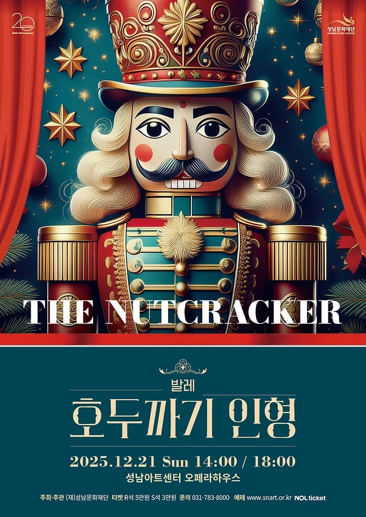 크리스마스 시즌 대표 공연인 발레 <호두까기 인형>. 크리스마스이브에 호두까기 인형을 선물받은 소녀 클라라가 꿈속 호두 왕자와 함께 눈의 나라로 떠나는 환상의 여정이 성남아트센터에서 펼쳐진다. 아름다운 음악과 눈길을 사로잡는 의상, 세계 각국의 춤과 박진감 넘치는 군무 등 볼거리와 즐길거리가 가득한 작품이다. 와이즈발레단이 기존 작품에 역동성과 새로운 해석을 더해 무대를 이끈다.