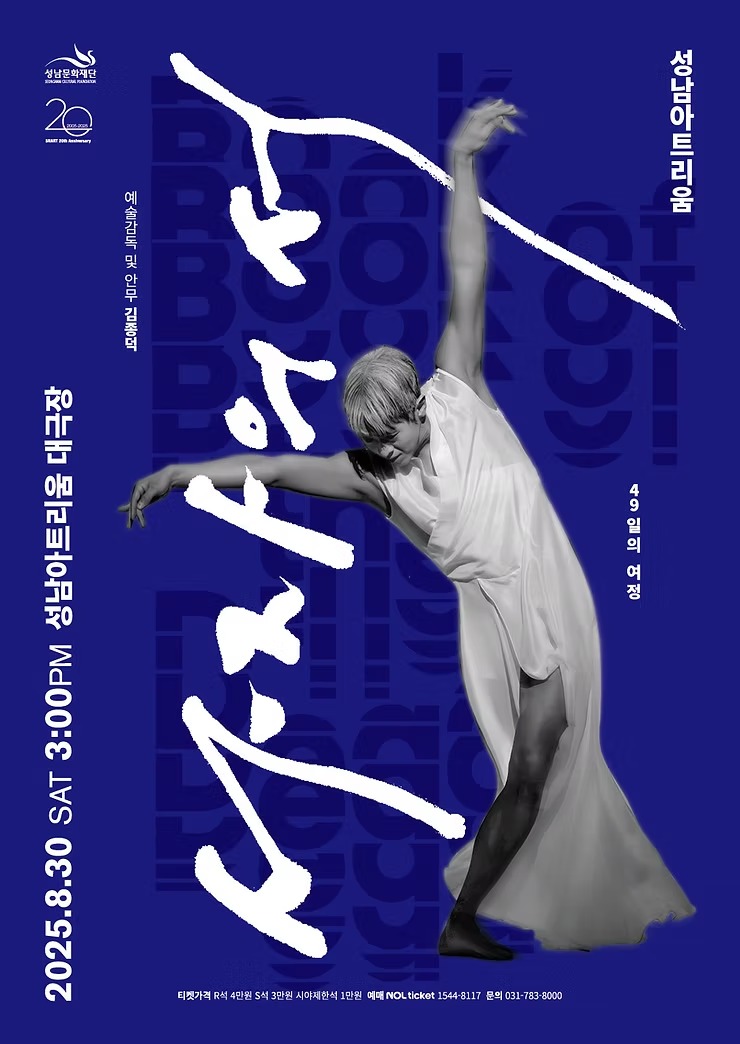 국립무용단의 <사자의 서>는 삶과 죽음에 대한 깨달음을 주는 불교 경전인 『티베트 사자의 서』에서 영감을 받은 작품으로, 죽음 후 망자가 겪는 49일의 여정을 총 3장에 걸쳐 보여 준다. 성남아트리움 무대의 규모에 맞게 25명이 출연하는 버전으로 재안무되었으며, 죽음 이후의 세계를 시각적으로 구현한 무대와 전통 복식에 현대성을 가미한 의상이 아름다운 미장센을 선사한다.