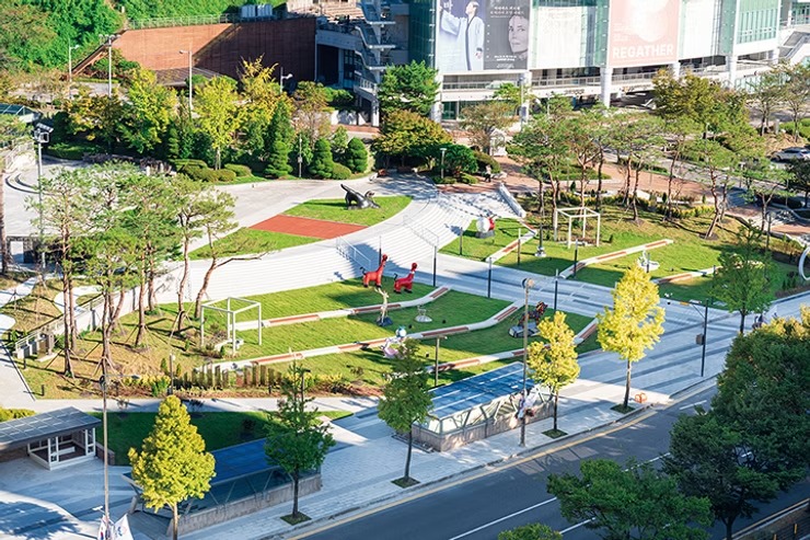성남아트센터 야외광장과 이어진 특화거리는 푸른 잔디밭과 멋진 야외 조각이 어우러진, 성남아트센터의 얼굴이 되어 주는 공간입니다. 봄에는 따스한 햇살, 폭신하게 자라난 잔디를 느끼며 간단한 피크닉을 즐기기에도 안성맞춤이고, 무더운 여름엔 언제든 특화거리 그늘 쉼터에서 쉬어갈 수 있죠. 가을의 특화거리는 푸른 하늘을 배경으로 한 야외무대로 변신합니다. 무용 퍼포먼스가 펼쳐지기도 하고, 온 가족이 즐길 수 있는 야외극장이 되기도 해요. 겨울이 오면 잔디는 잠시 겨울잠을 자겠지만, 하얀 눈이 소복이 쌓인 풍경을 즐길 수 있답니다.