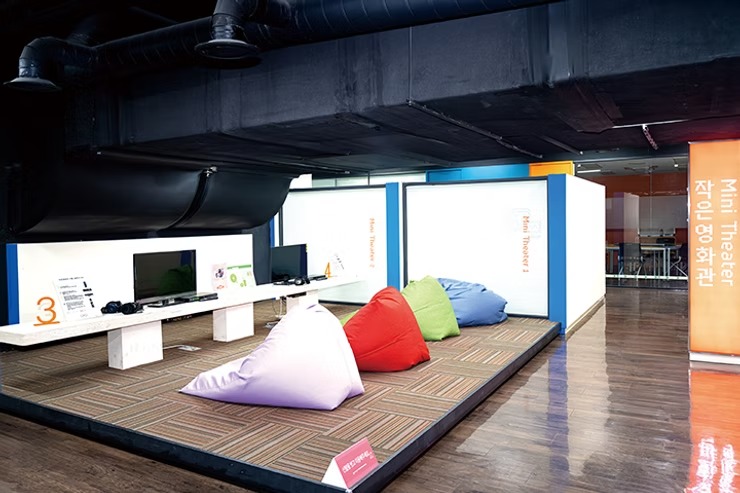 성남아트센터를 찾아오시는 모두에게 숨은 꿀스팟을 소개합니다! 이번에 소개할 꿀자리는 바로 다양한 미디어 교육과 커뮤니티 활동이 진행되는 성남미디어센터 2층에 마련된 휴식 공간, ‘작은영화관’과 ‘미디어도서관’입니다.
