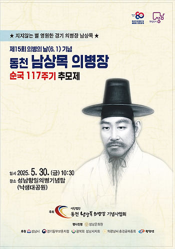 성남 출신 항일 의병장이자 ‘경기도 선정 80명의 독립운동가’인 동천 남상목 의병장(1876~1908) 순국 117주기 추모제가 5월 30일(금) 성남시 분당구 낙생대공원 내 ‘성남항일의병기념탑’에서 거행되었다. (사)남상목의병장기념사업회유족 대표 남기형·남수현 주최, 성남문화원 진행, 성남시와 경기동부보훈지청 후원으로 진행된 추모제는 성남연극협회·성남시립국악단·벨칸토 합창단·춤자이예술단 등 예술인들의 헌정 공연과 각계 인사의 추모사로 애국의 의미를 되새겼다.
