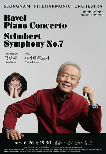 성남시립교향악단의 6월 정기연주회가 6월 26일(목) 성남아트센터 콘서트홀에서 열린다. 예술총감독 금난새의 지휘, 피아니스트 유키네 쿠로키의 협연으로 라벨 피아노 협주곡과 슈베르트 교향곡 7번을 들려준다.