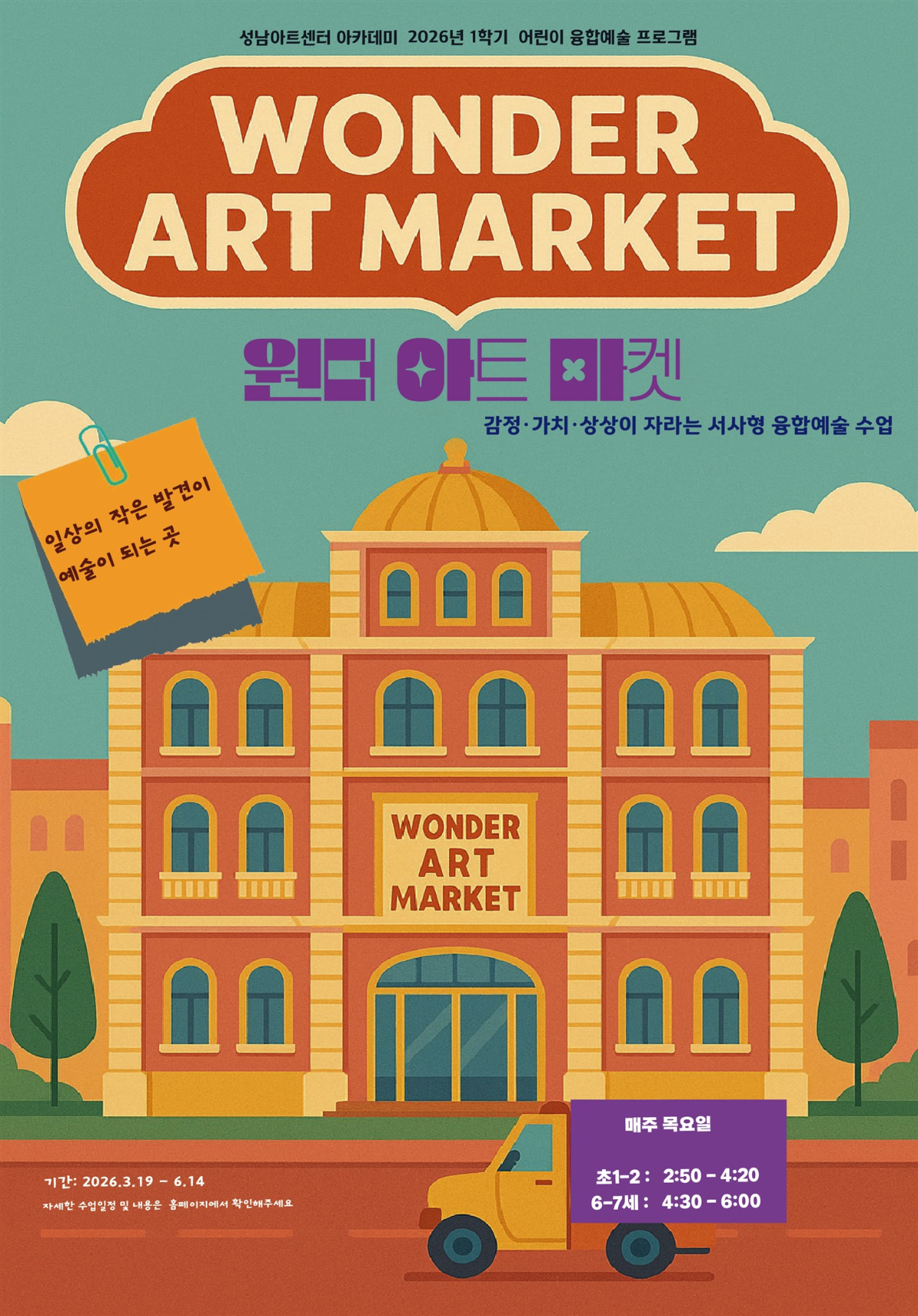 원더아트마켓은 완성된 결과보다 아이의 마음속에 피어나는 발견 · 탐험 · 서사 · 표현의 흐름을 중요하게 여깁니다.