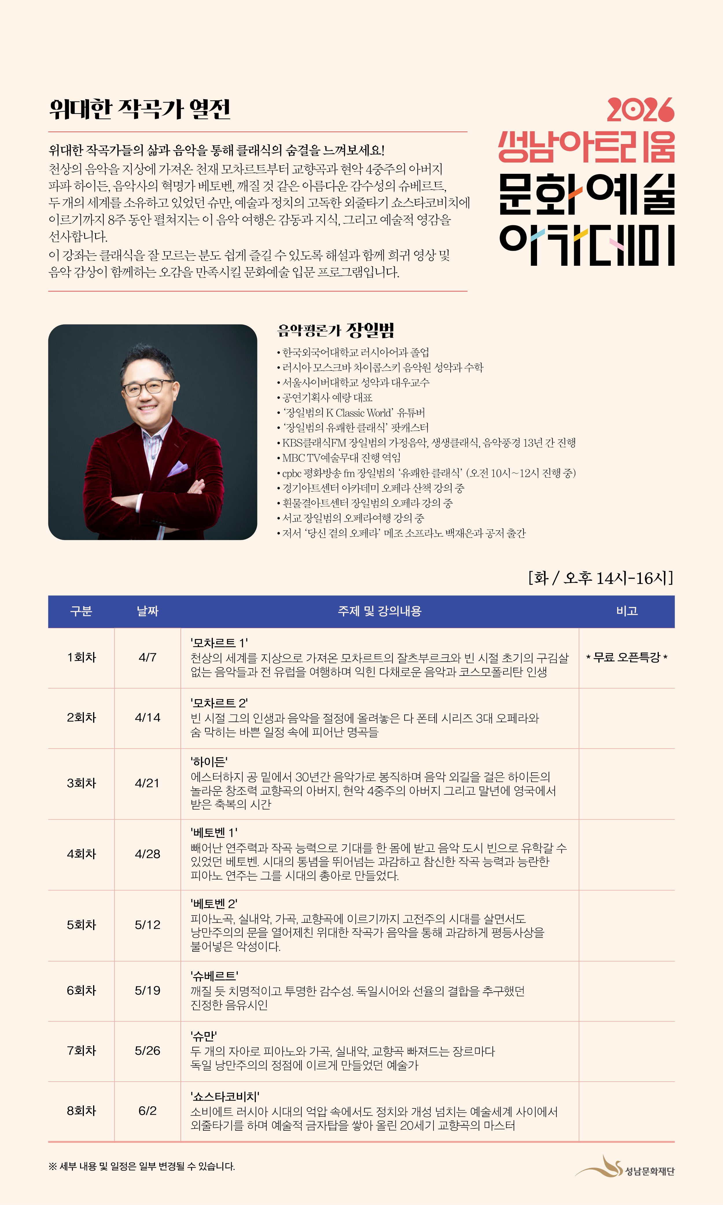 | 8 | 2026-06-02 | '쇼스타코비치‘ 소비에트 러시아 시대의 억압 속에서도 정치와 개성 넘치는 예술세계 사이에서 외줄타기를 하며 예술적 금자탑을 쌓아 올린 20세기 교향곡의 마스터 |