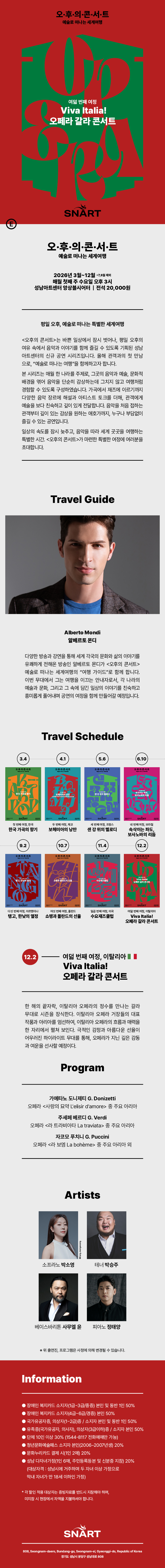 - 장애인 복지카드 소지자(1급~3급) 본인 및 동반 1인 50% - 장애인 복지카드 소지자(4급~6급) 본인 50% - 국가유공자증, 의상자증(1~2급) 소지자 본인 및 동반 1인 50% - 유족증(국가유공자, 의사자), 의상자증(3급이하) 소지자 본인 50% - 청년문화예술패스 소지자 본인(2006~2007년생) 20% - 문화누리카드 결제시 1인 2매 20% - 성남 다자녀가정 : 1인 6매(주민등록등본&신분증 지참) 20% * 대상자격 : 성남시에 거주하며 두 자녀 이상 가정으로 막내 자녀가 만 18세 이하인 가정 - 단체 10인 이상 30% (1544-8117 전화예매)