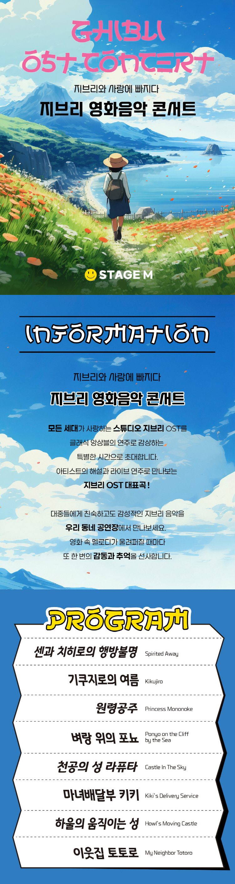 - 본 공연은 영상 없이 아티스트의 해설과 앙상블 연주로 진행되는 지브리 영화음악 콘서트입니다.